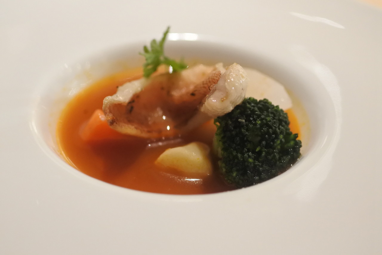 カサゴのポアレ 根菜スープ仕立て、