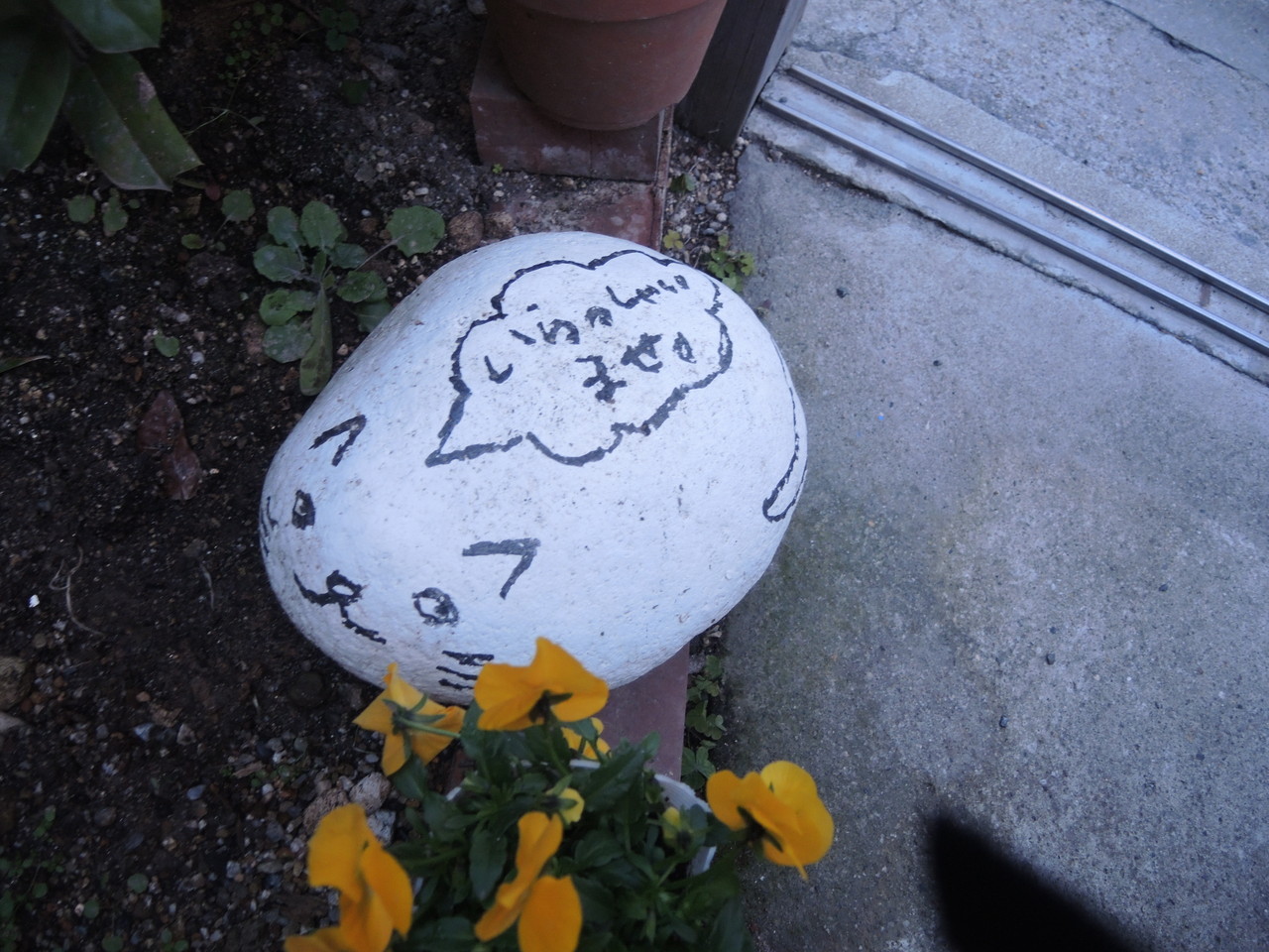 入り口のところには落書きされた石。