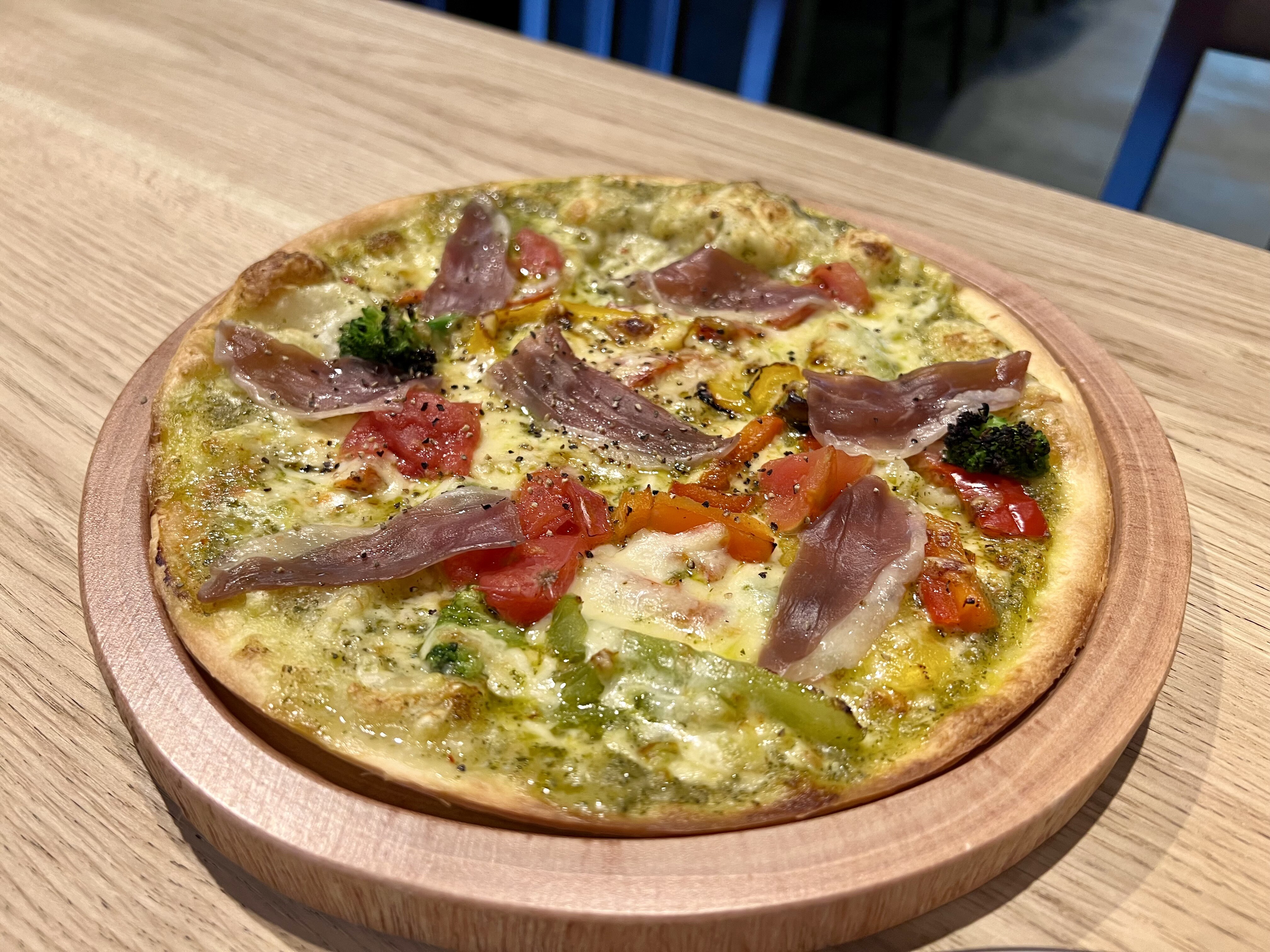 薄めの生地に京鴨の生ハムがめっちゃ合うよ🦆