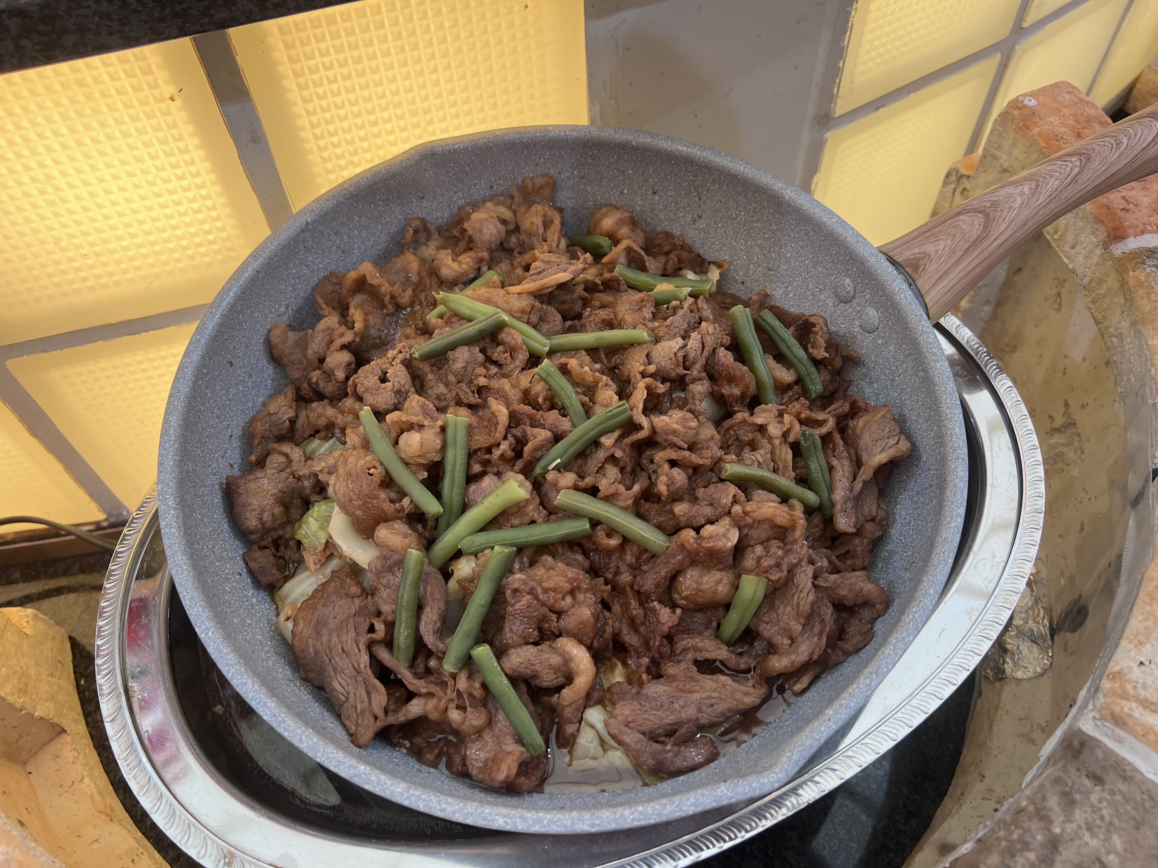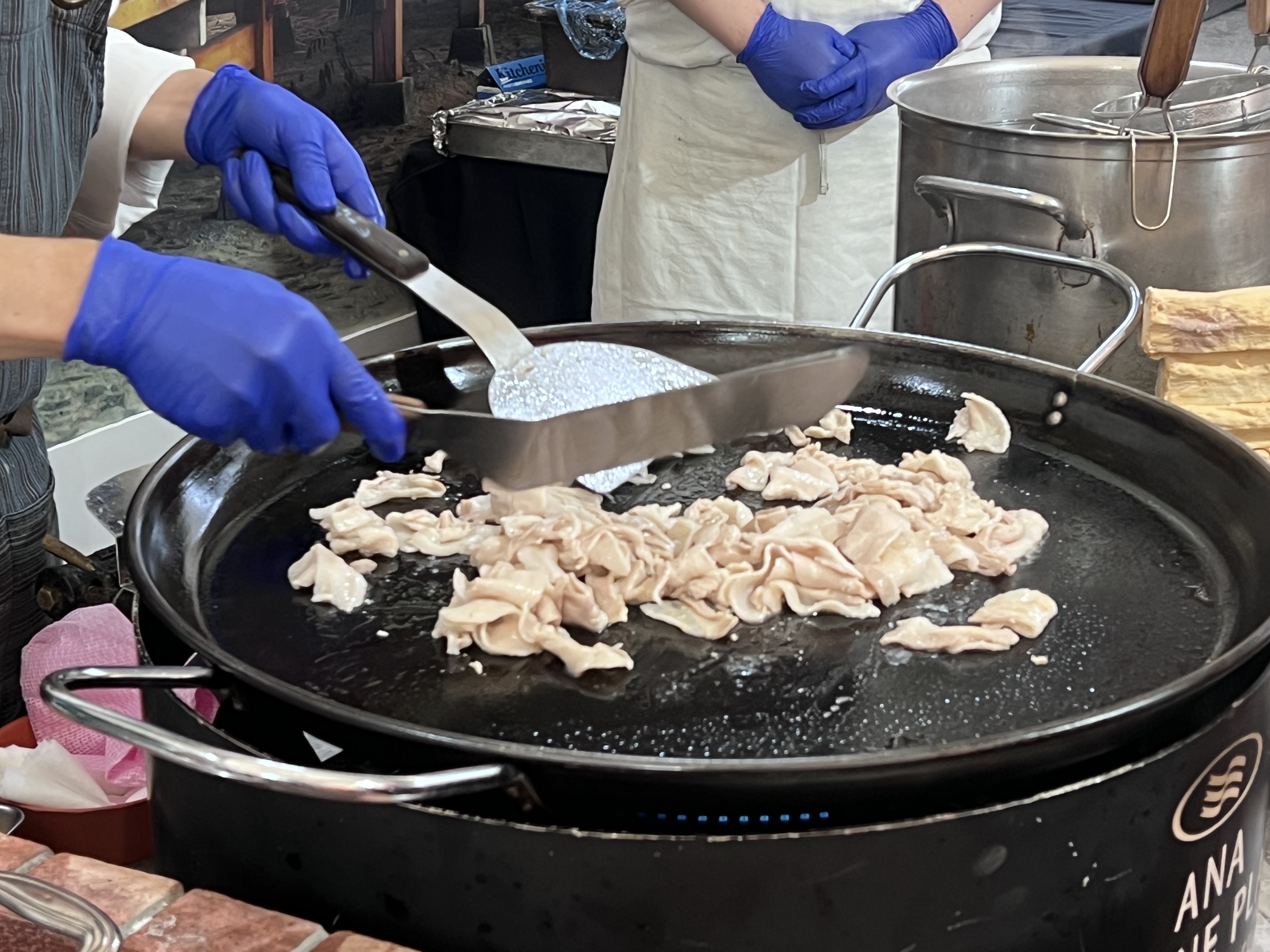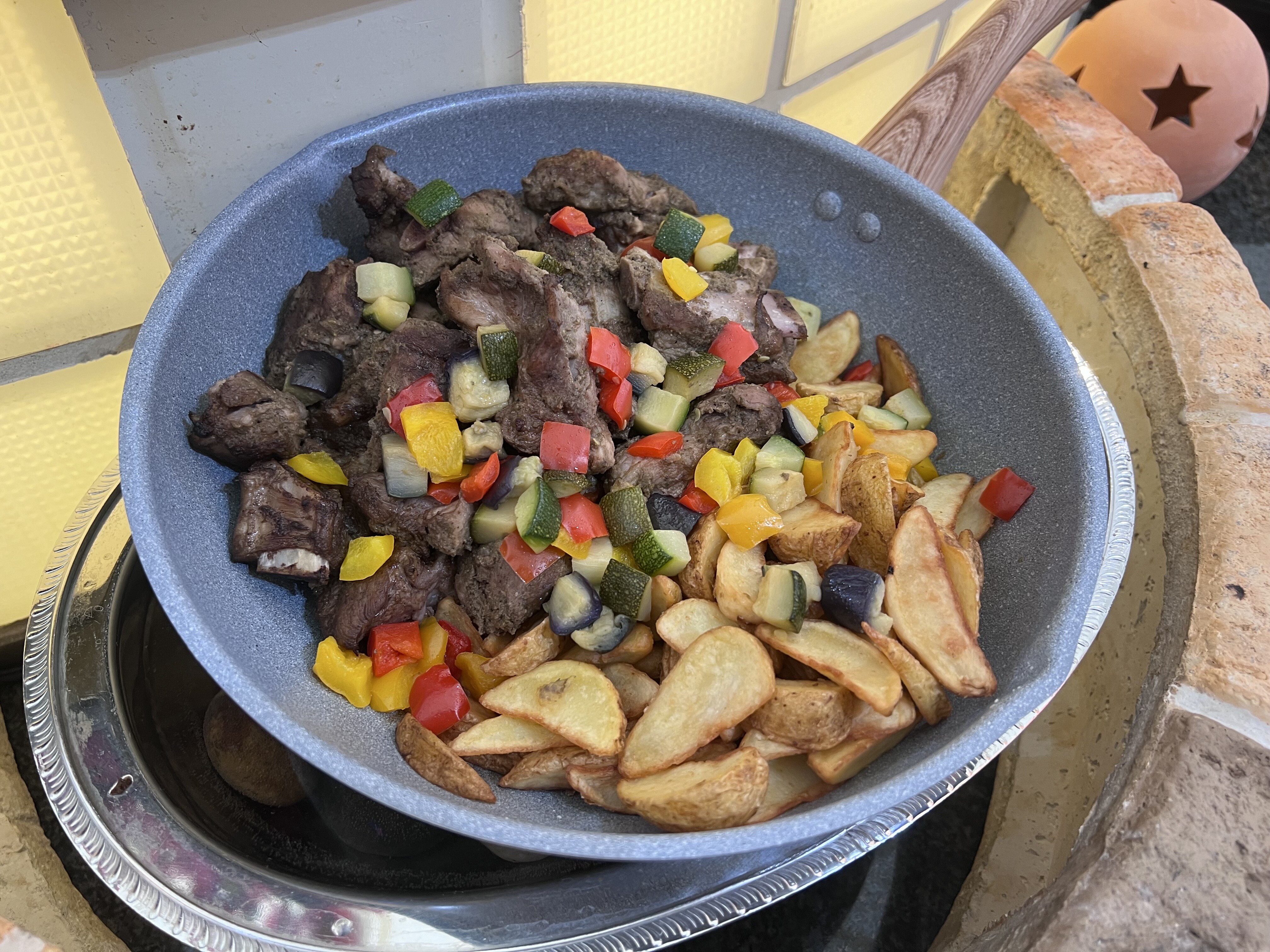 ・巨大パエリアパンで焼く豚バラ、ジャガイモ、トウモロコシ