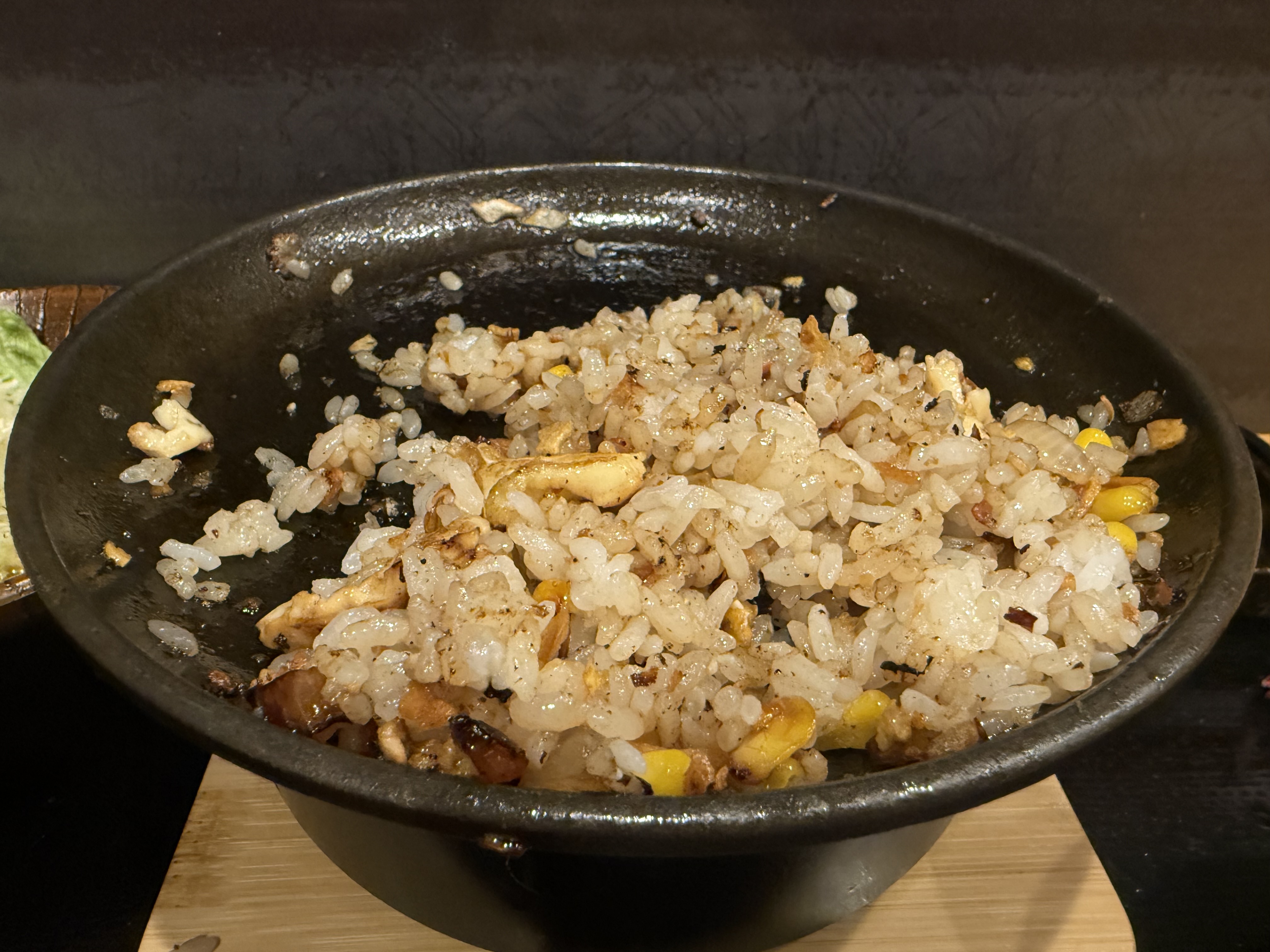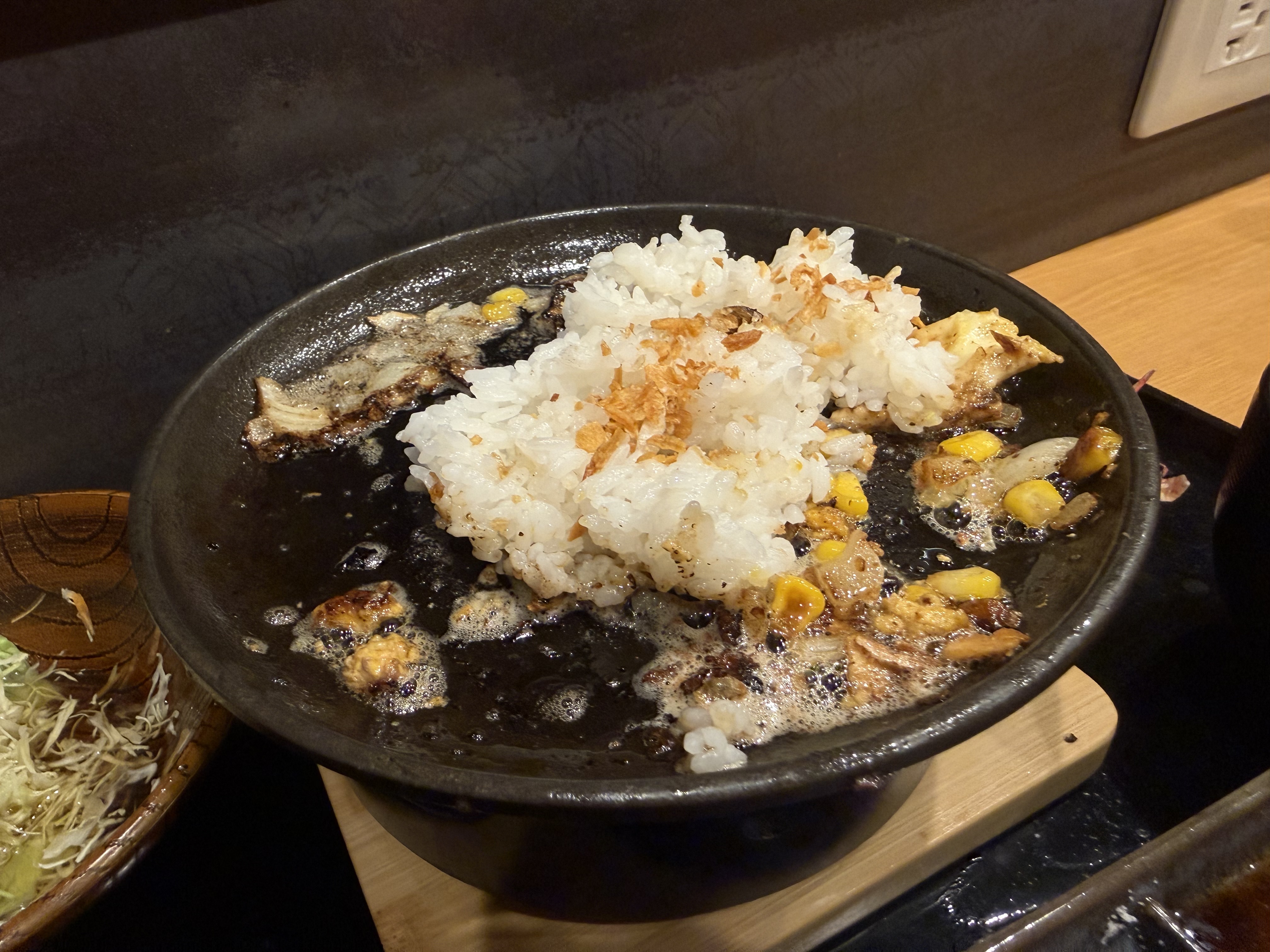 鉄皿の上に肉汁がでるからご飯とニンニクチップを
