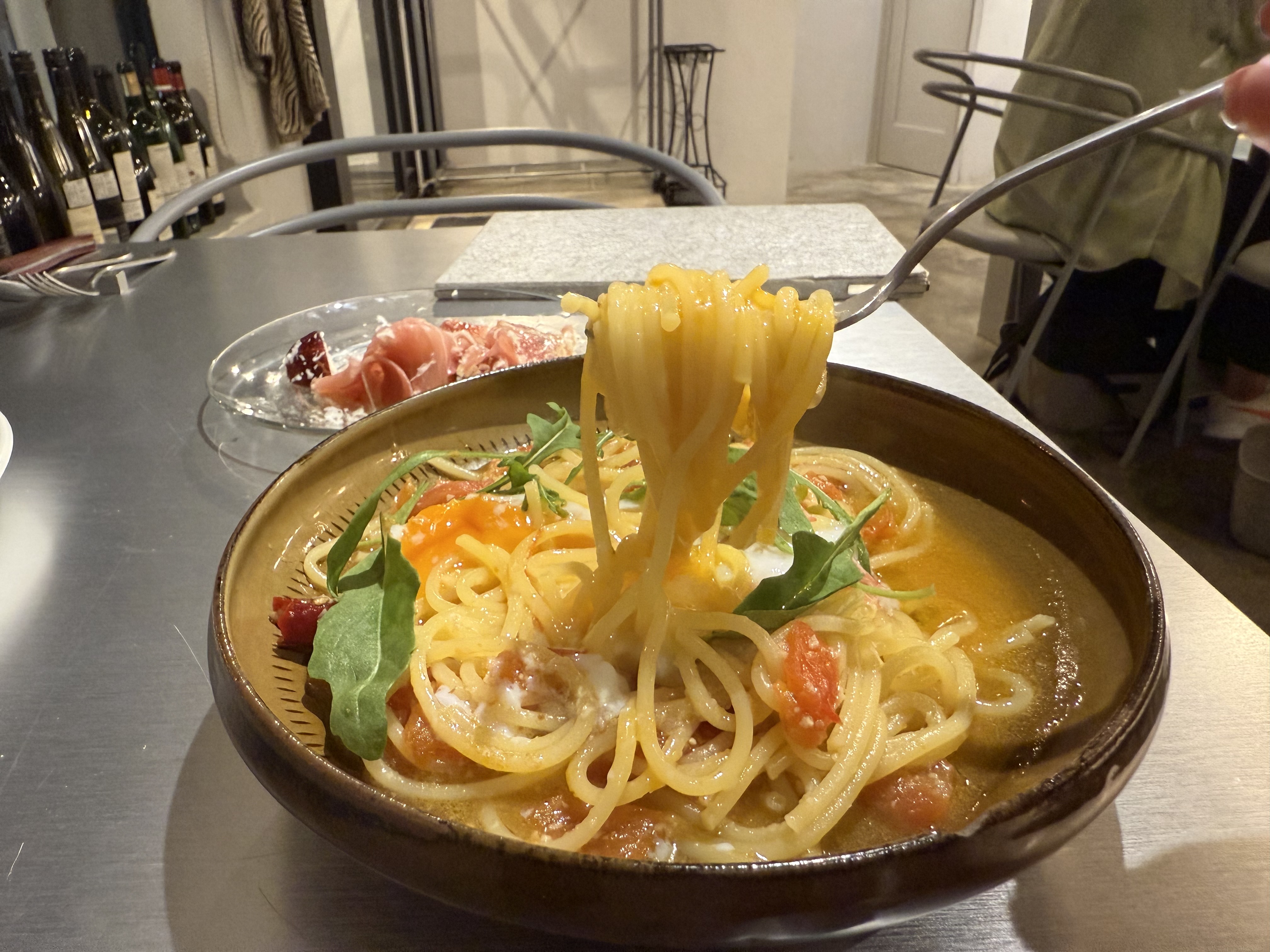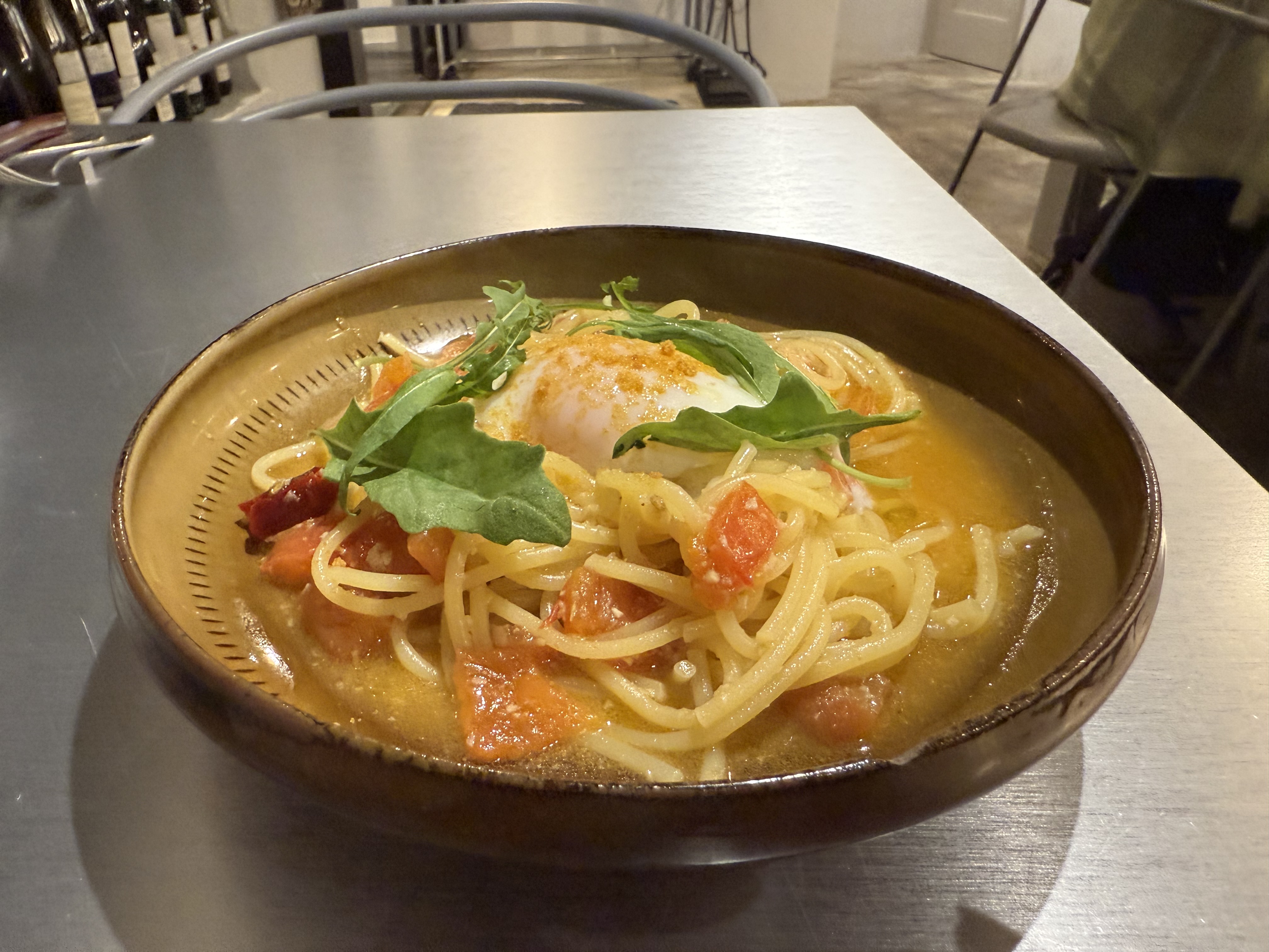 この日は温玉が乗った生パスタでトマトや
