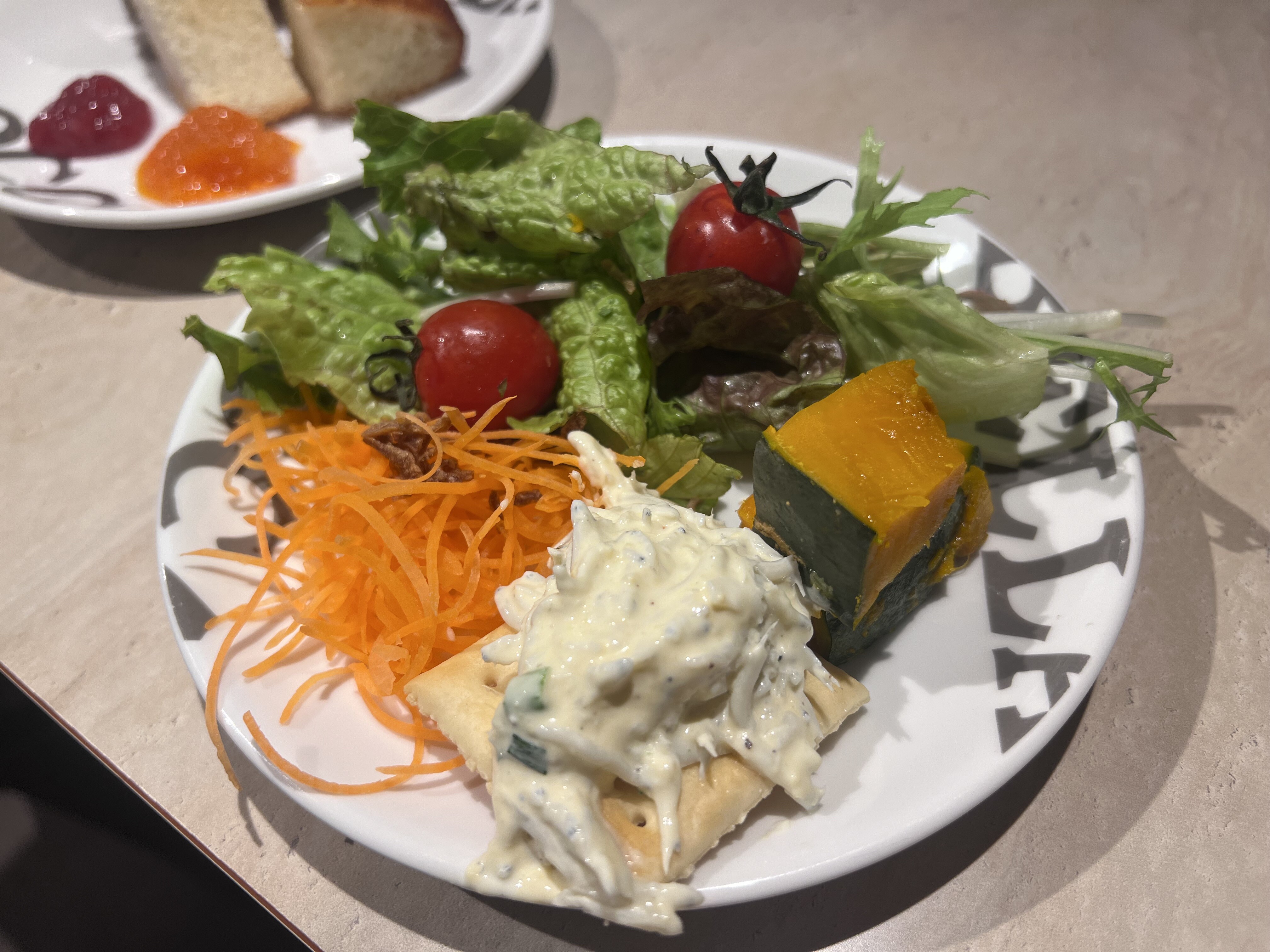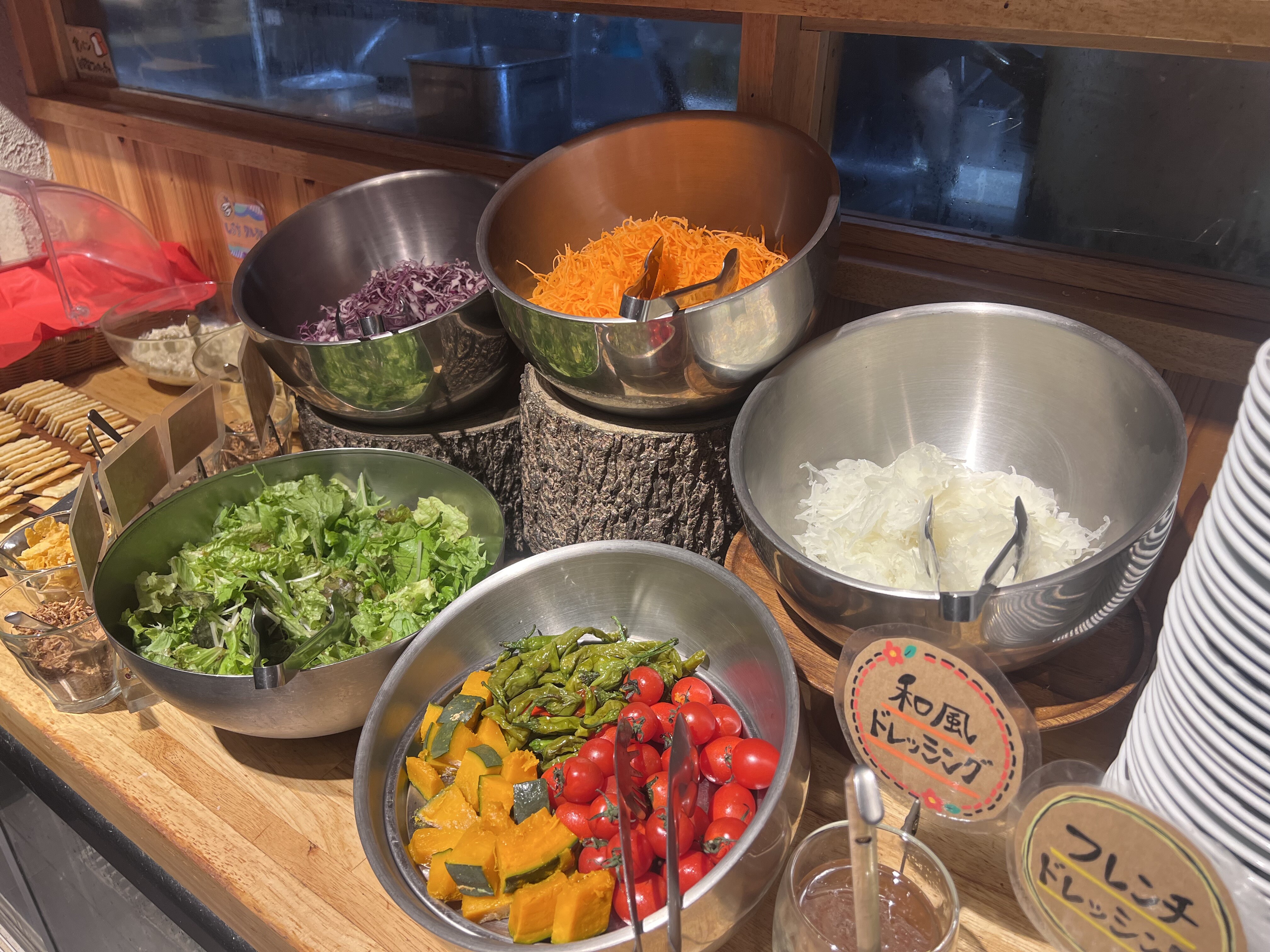 サラダやドリンク、クラッカーなどがおいて