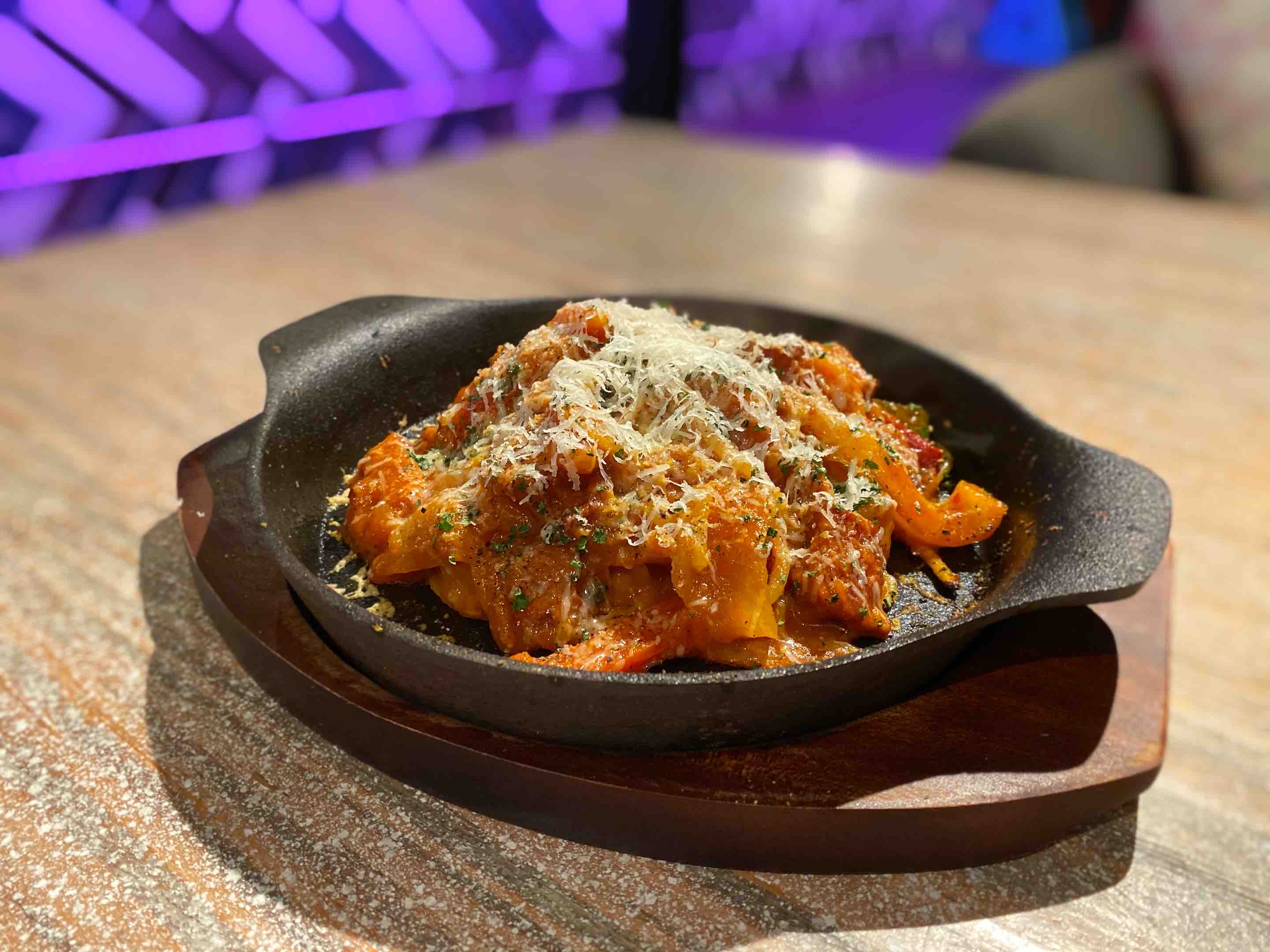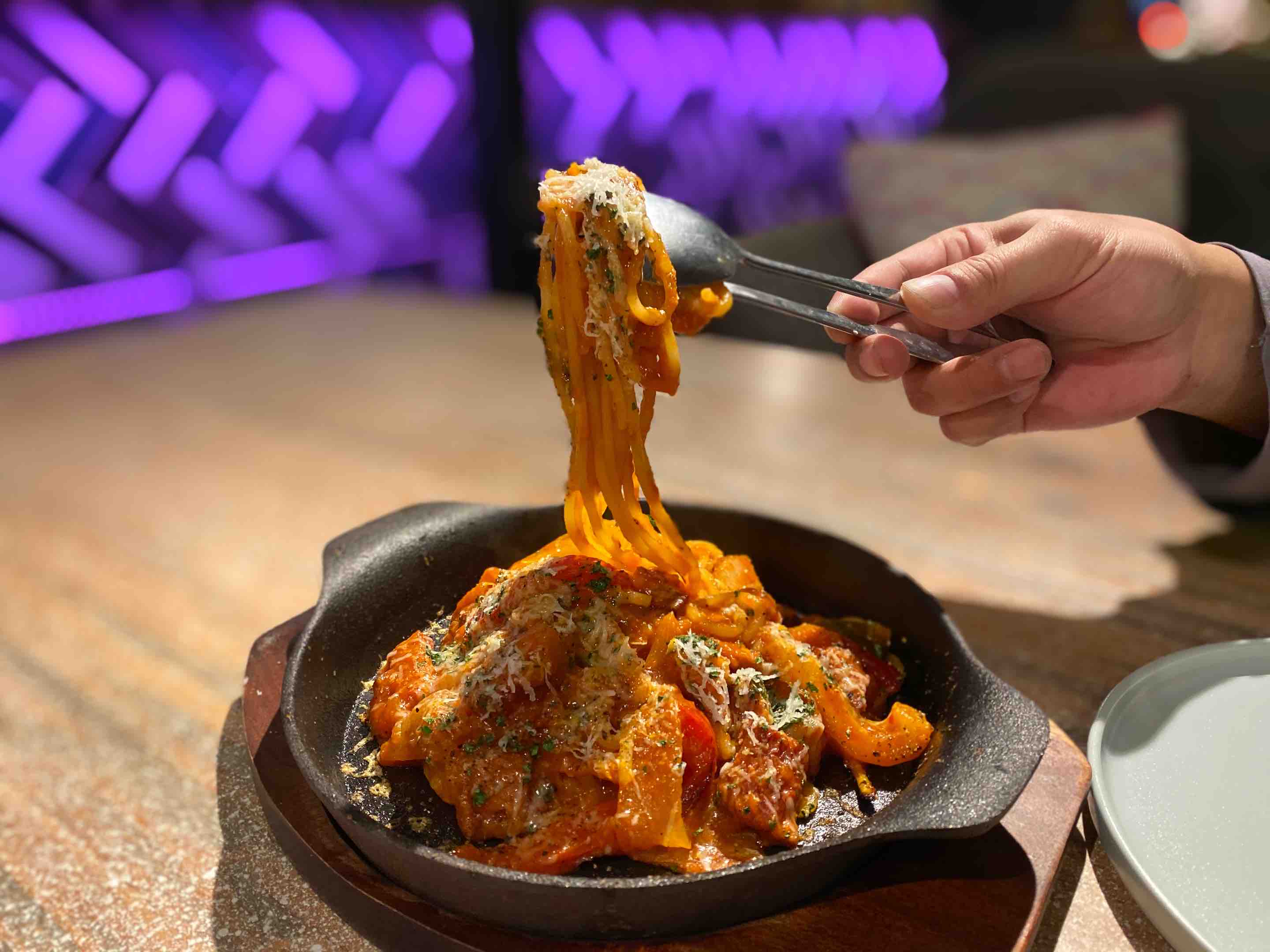 ★アツアツ鉄鍋で食べる焼きナポリタン 1,180円。