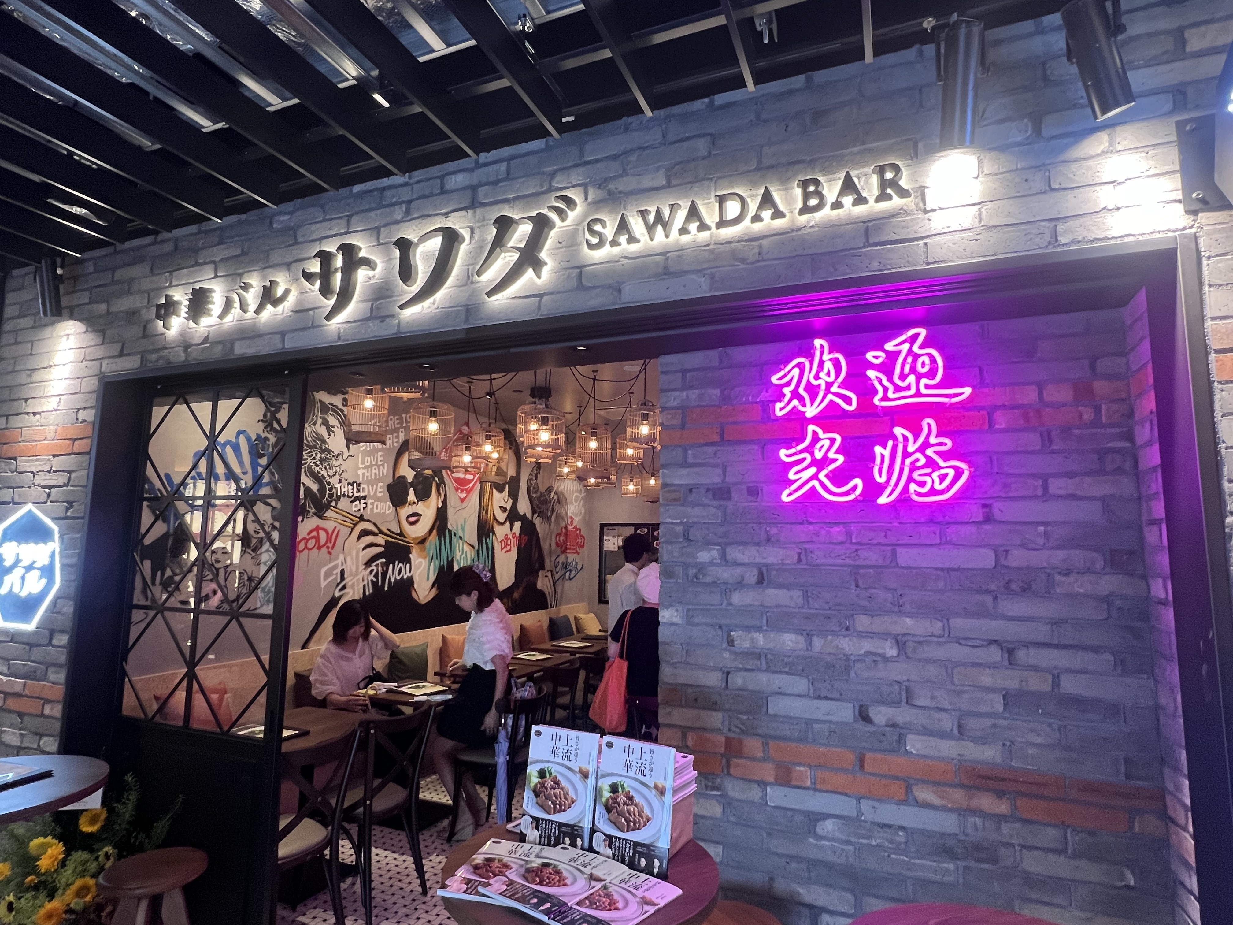 お店はカラフルなネオンがあったり